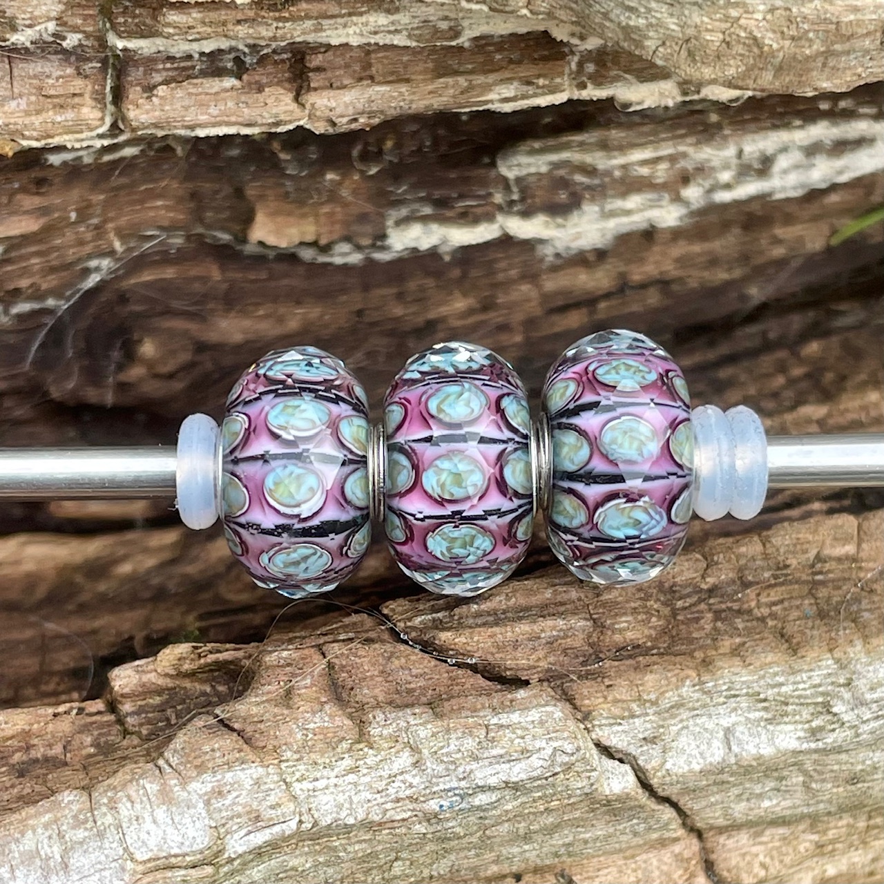 Schichten aus violettem Abendhauch und sanftem Grün lassen ihre Blüten durch klares Glas aufleuchten. Die facettierte Oberfläche verleiht jedem handgefertigten Bead einen leisen Schimmer, eine zurückhaltende Eleganz, die sich erst im Innehalten offenbart.