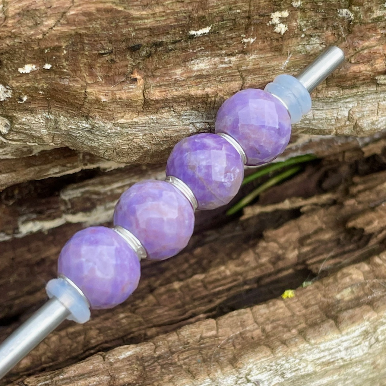 Der handgeschliffene Edelstein zeigt zarte Lavendertöne bis hin zu tiefem Purpur. Jede einzelne Jade variiert leicht in Tiefe und Farbnuance, ein Ausdruck der einzigartigen, natürlichen Schönheit des Steins.